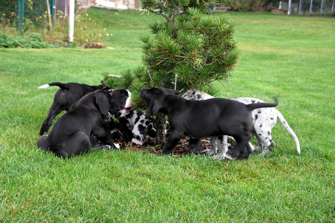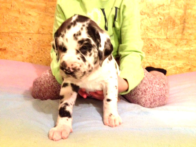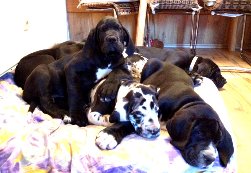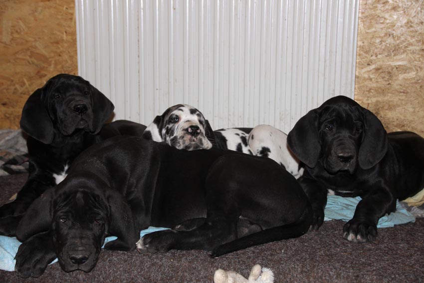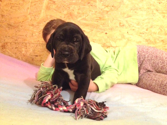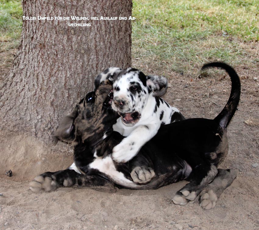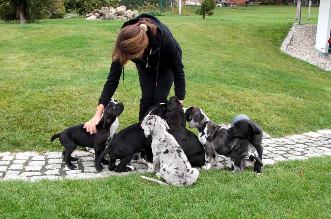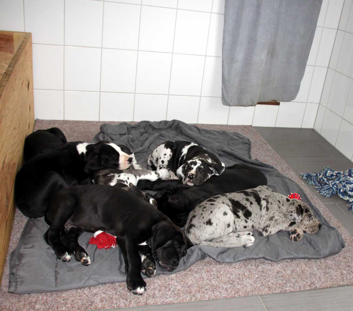 Wir haben uns den Wurf angeschaut und konnten uns nur schwer von den kleinen Rackern trennen. Wir kannten bis dato weder die Züchter, Fam. Wolter, noch deren Zwingeranlage und waren sehr angenehm überrascht. So stellt man sich die Haltung Deutscher Doggen vor. Die Anlage ist gut durchdacht gebaut, der Welpenraum ist zweckmäßig mit einer schönen Welpenkiste, hell, gepflegt und einem Ausgang zum Freigehege. Schade, dass eine solche Haltung und Aufzucht selten zu sehen sind. Vor allem auch, dass die Züchter genug Zeit haben, sich um ihre Doggen zu kümmern und ihnen ausreichend Zuwendung und Familienanschluß zu bieten.