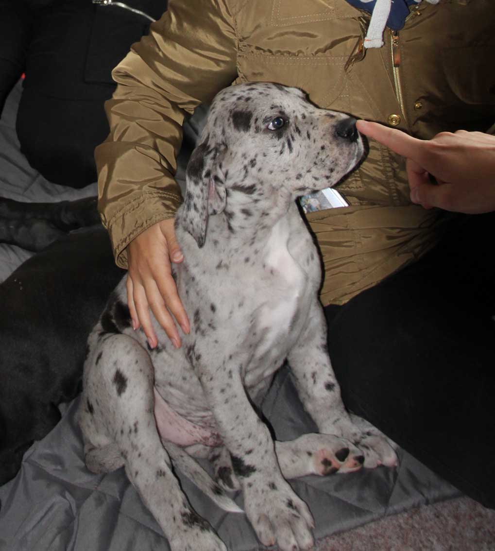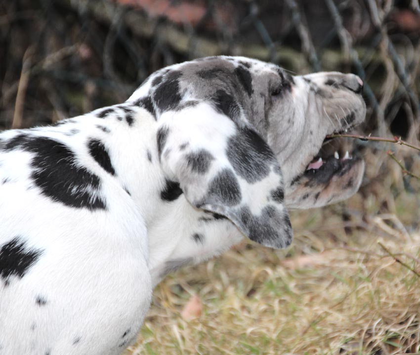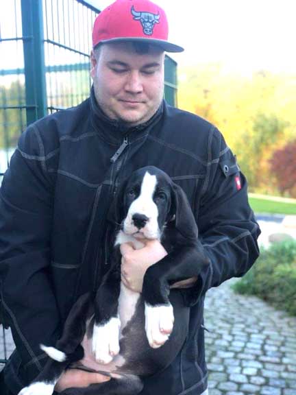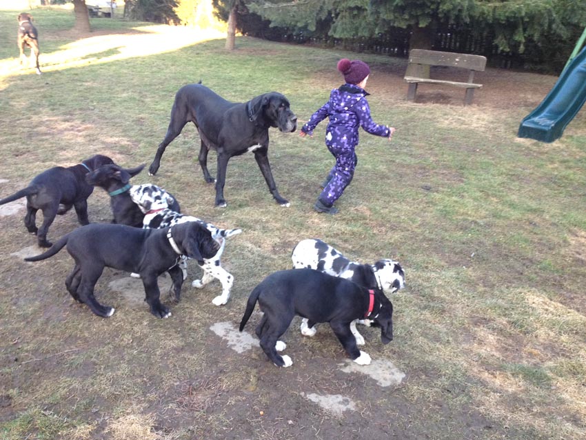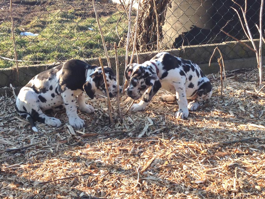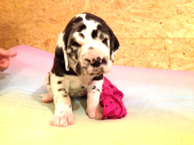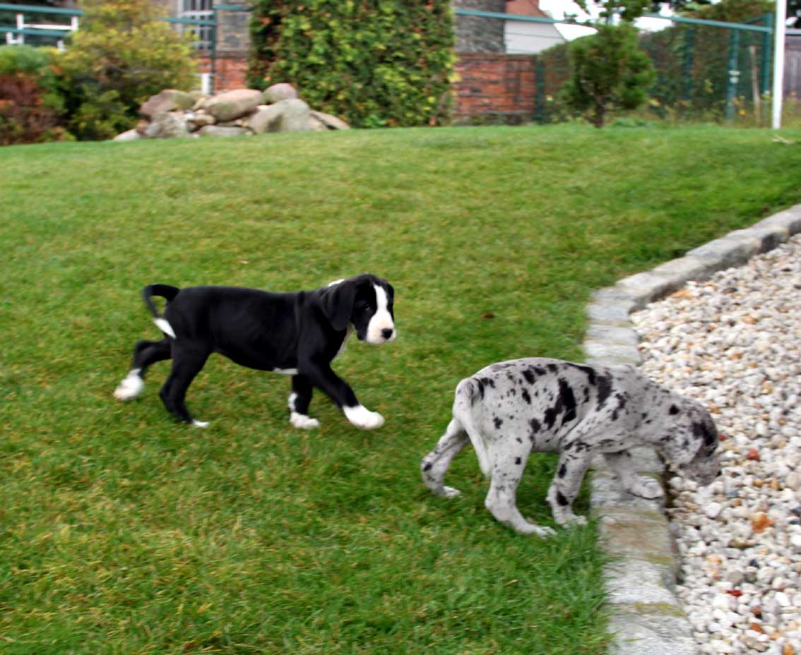 Wir haben uns den Wurf angeschaut und konnten uns nur schwer von den kleinen Rackern trennen. Wir kannten bis dato weder die Züchter, Fam. Wolter, noch deren Zwingeranlage und waren sehr angenehm überrascht. So stellt man sich die Haltung Deutscher Doggen vor. Die Anlage ist gut durchdacht gebaut, der Welpenraum ist zweckmäßig mit einer schönen Welpenkiste, hell, gepflegt und einem Ausgang zum Freigehege. Schade, dass eine solche Haltung und Aufzucht selten zu sehen sind. Vor allem auch, dass die Züchter genug Zeit haben, sich um ihre Doggen zu kümmern und ihnen ausreichend Zuwendung und Familienanschluß zu bieten.