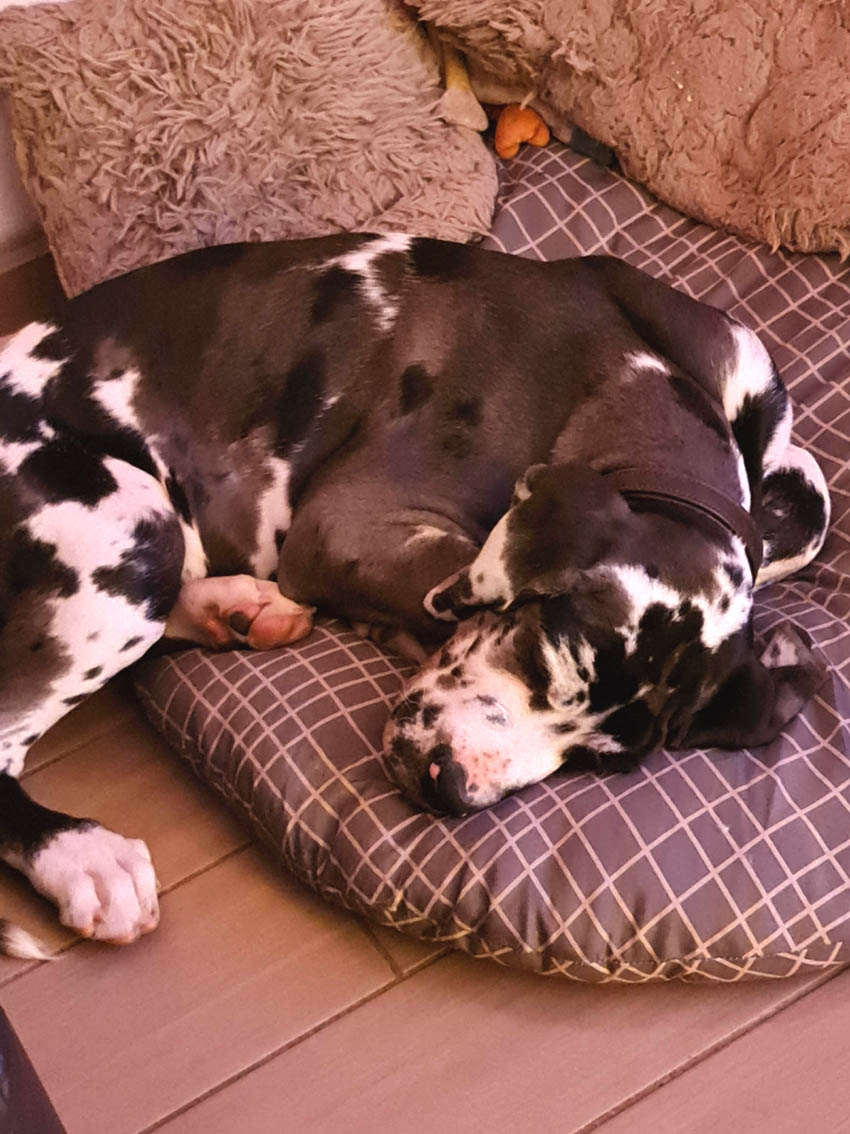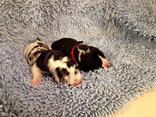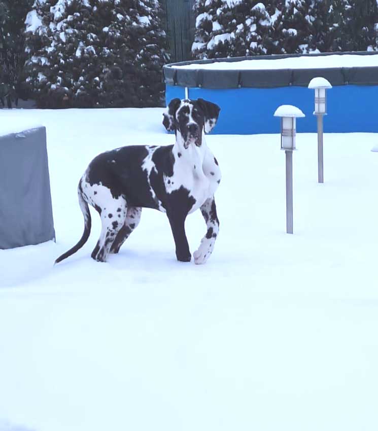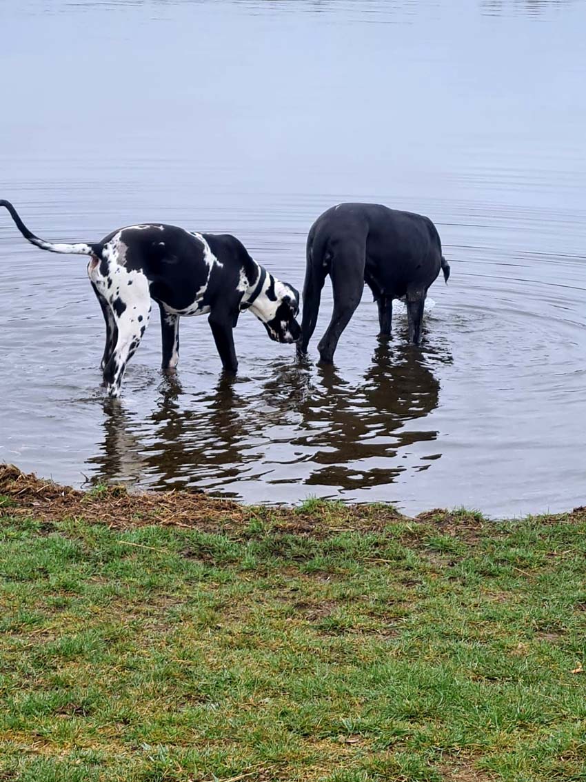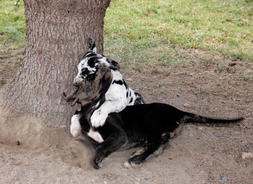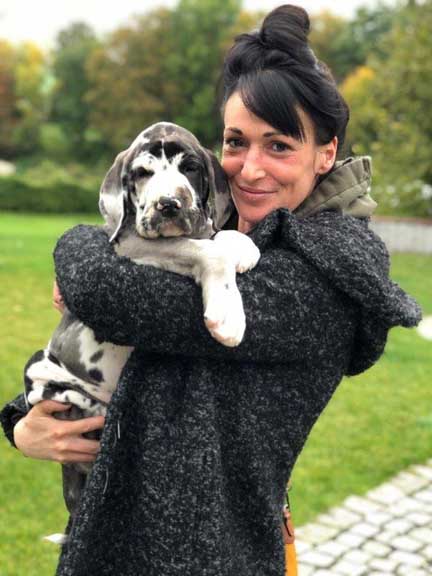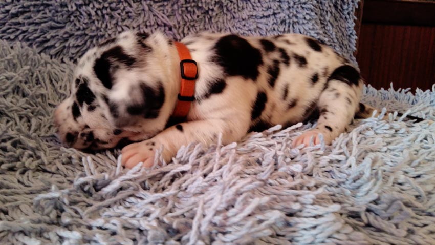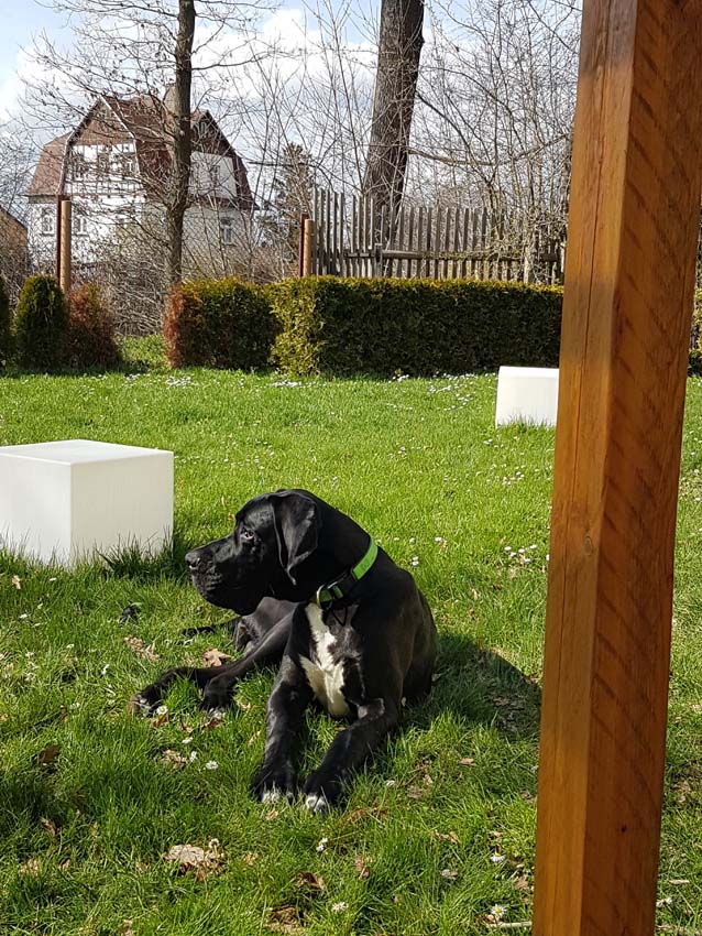 Wir haben uns den Wurf angeschaut und konnten uns nur schwer von den kleinen Rackern trennen. Wir kannten bis dato weder die Züchter, Fam. Wolter, noch deren Zwingeranlage und waren sehr angenehm überrascht. So stellt man sich die Haltung Deutscher Doggen vor. Die Anlage ist gut durchdacht gebaut, der Welpenraum ist zweckmäßig mit einer schönen Welpenkiste, hell, gepflegt und einem Ausgang zum Freigehege. Schade, dass eine solche Haltung und Aufzucht selten zu sehen sind. Vor allem auch, dass die Züchter genug Zeit haben, sich um ihre Doggen zu kümmern und ihnen ausreichend Zuwendung und Familienanschluß zu bieten.
