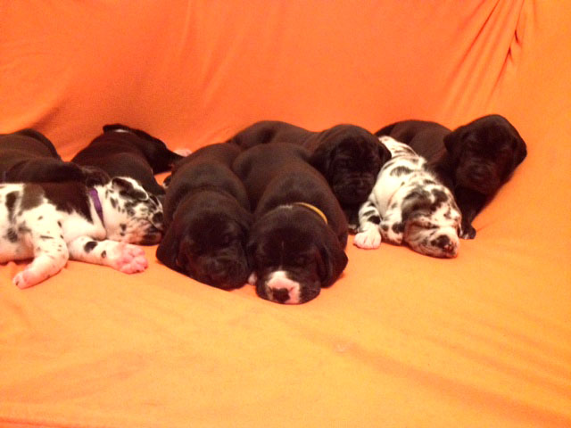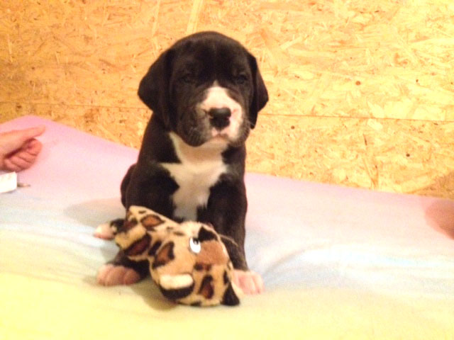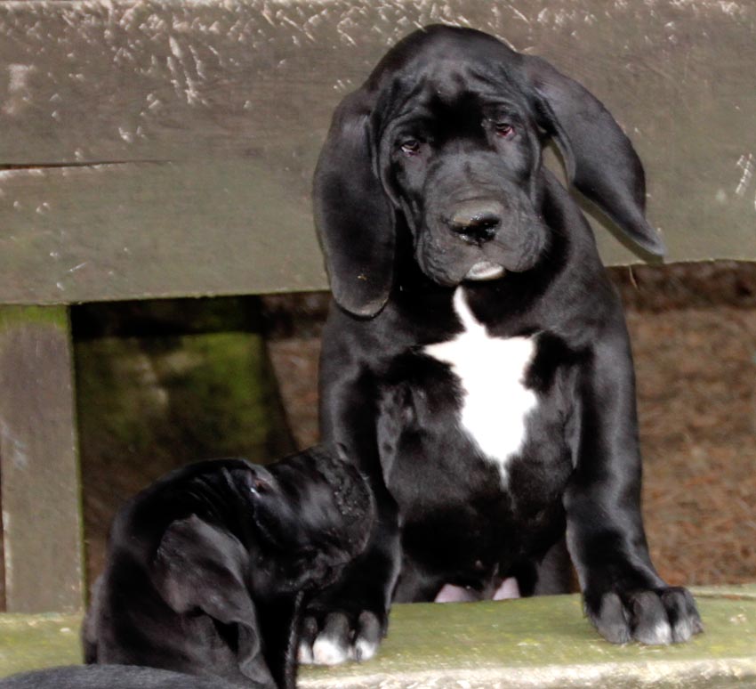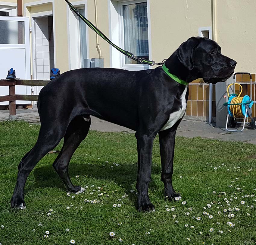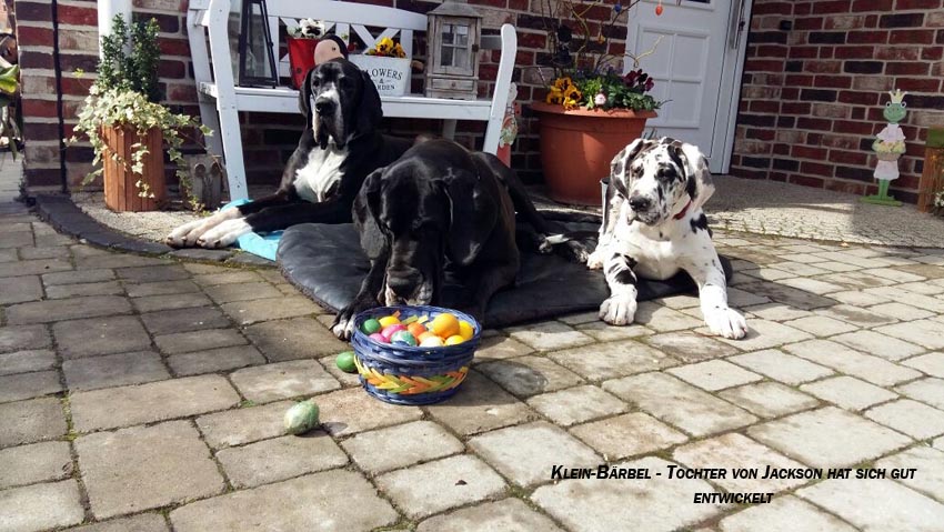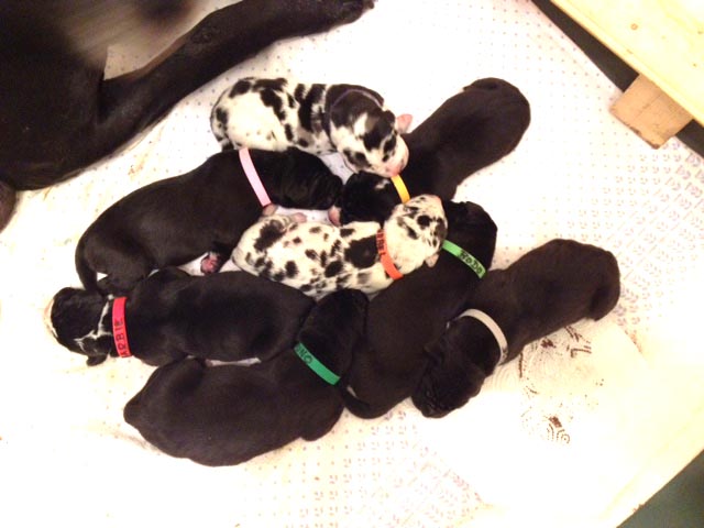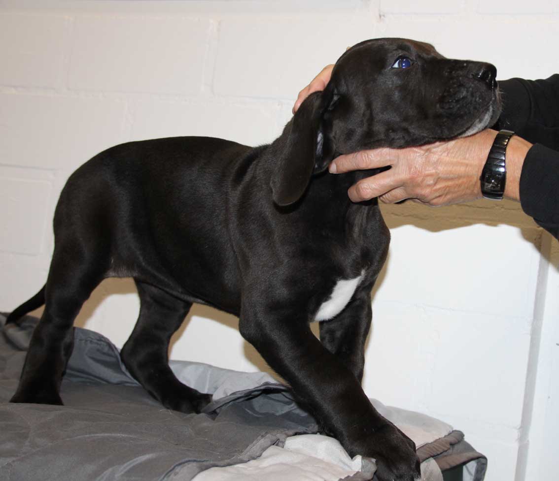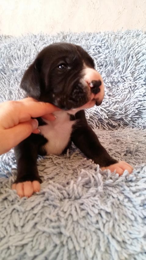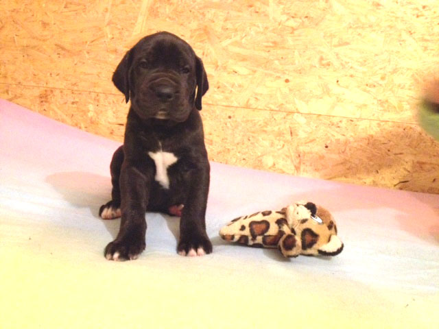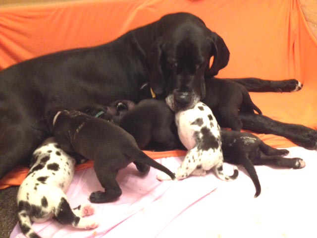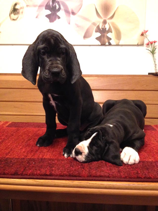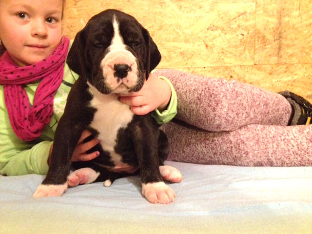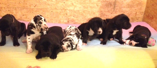 Mein 1. Stelldichein mit der schwarzen Perle " Cassandra v. Harbker Schloß" hat Früchte getragen - ich wurde am 17.12.2016 Papa von 8 gesunden und hübschen Doggenbabys. Mit 8 Wochen wurde die Wurfabnahme durch den verantwortlichen Zuchtwart des DDC 1888 e.V. durchgeführt. Allen Welpen wurden korrekte Scherengebisse, gut geschlossene Augen, Katzenpfoten und vorhandene Hoden bescheinigt.