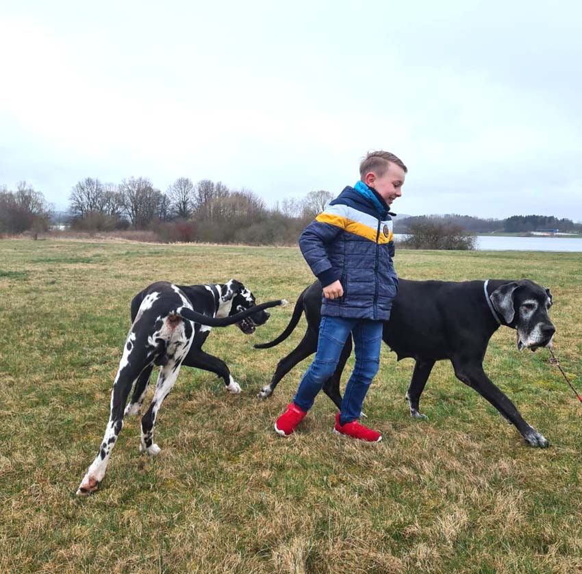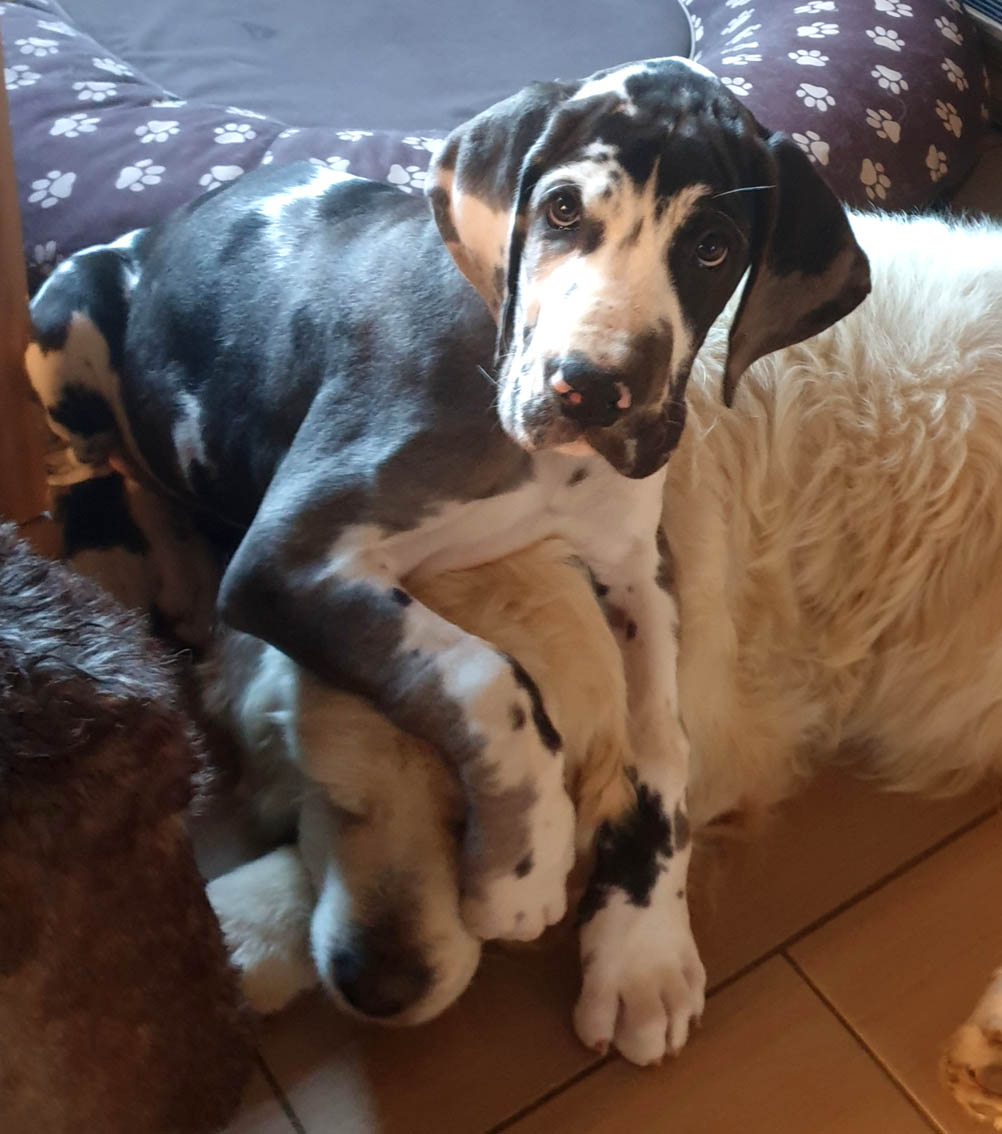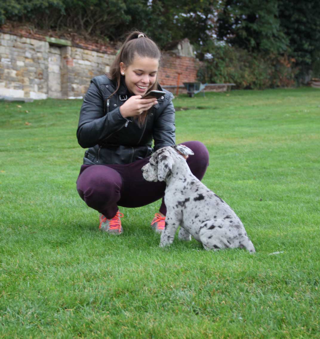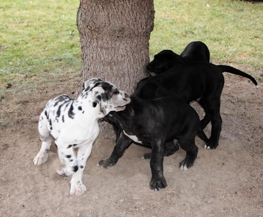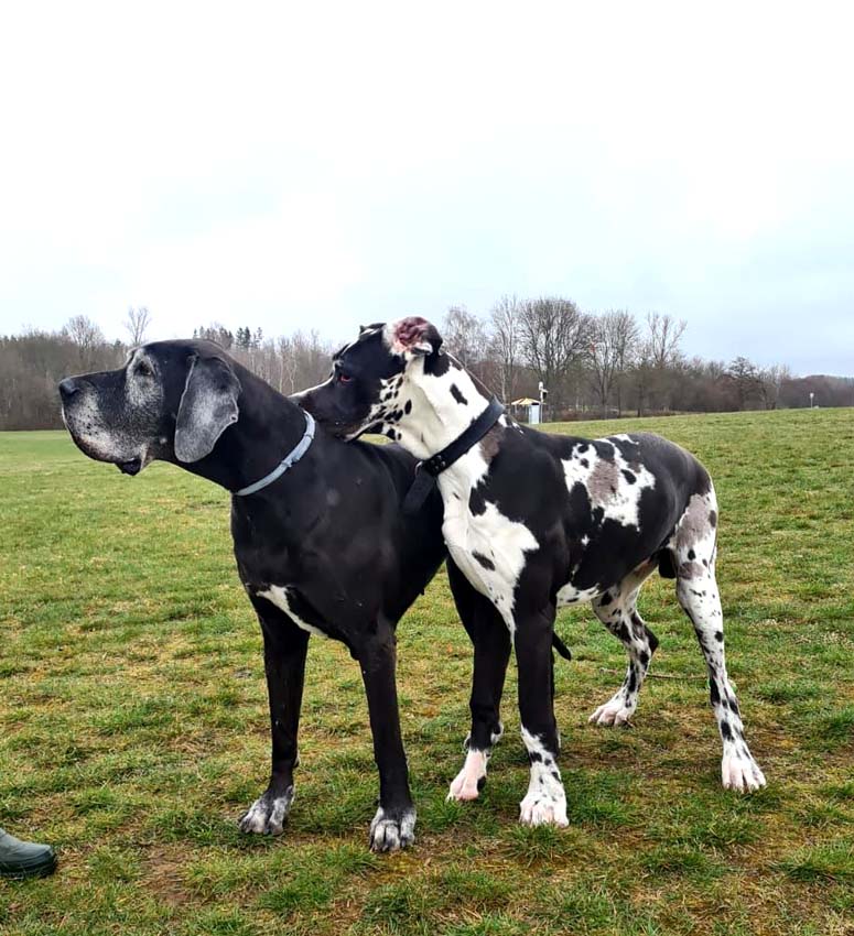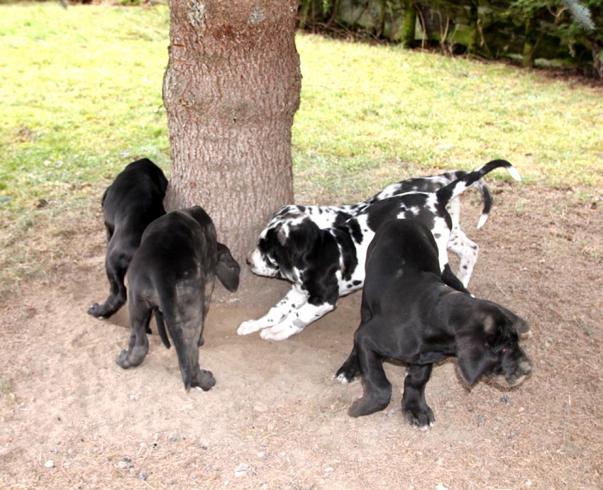 Am 1. Oktober 2017 wurden wir zum Welpentreffen nach Lossa eingeladen. 5 Welpenbesitzer hatten zugesagt und waren auch anwesend, was sehr beachtenswert ist. Die 3 schwarzen Rüden waren für das Alter von 9 1/2 Monaten sehr groß und kräftig. Alle Junghunde stehen auf sehr schönen Katzenpfoten und auf geraden, kräftigen Läufen. Die gefleckten Hündinnen haben eine reinweiße Grundfarbe. Alle dort anwesenden Hunde haben ein Scherengebiß. Es war ein gelungenes Treffen mit einem angeregten Informationsaustausch. Wir haben wieder nette, aufgeschlossene Doggenleute kennengelernt, die das Wohl ihrer Lieblinge im Auge haben. Wir danken Fam. Weihrauch für diesen schönen Tag.