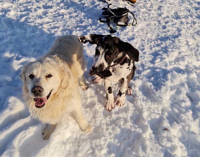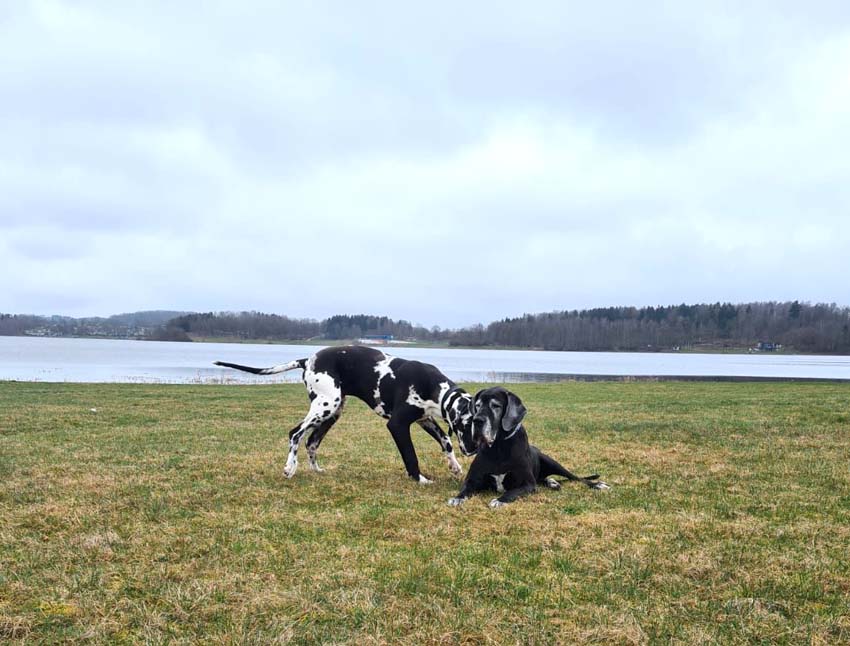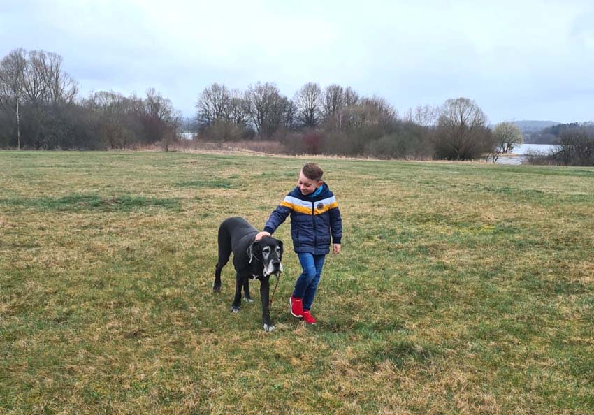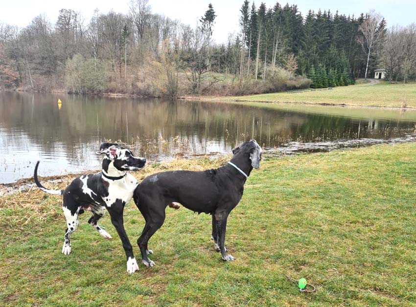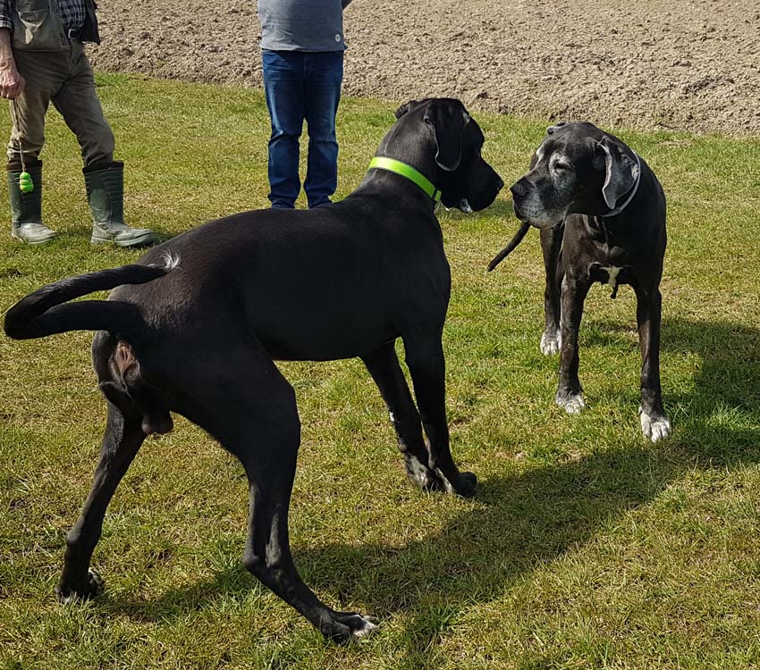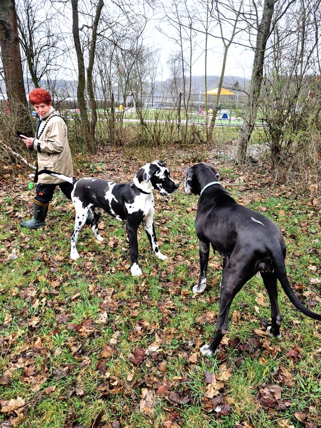 Wir haben uns gefreut, dass Familie Münch mit Goran zu Besuch gekommen ist. Wir trafen uns zum Spaziergang, auf welchem Goran seine Großmutter, Esmee´ kennenlernte. Goran ist für sein Alter sehr groß, anatomisch gut entwickelt und kräftig. Seine Annäherungsversuche und Aufforderungen zum Spielen Esmee´gegenüber wurden gelassen aber bestimmt von ihr unterbunden.